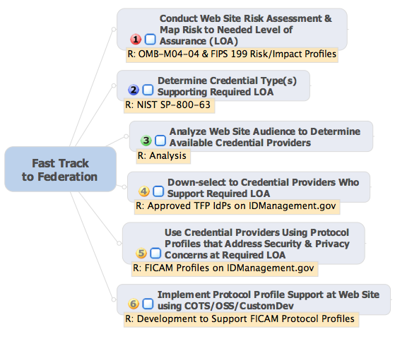 - Determine the target audience for the web site and see what credential providers they have available to them (e.g. OpenID 2.0 IdP, SAML 2.0 IdP, PIV/PIV-I Cards etc.)