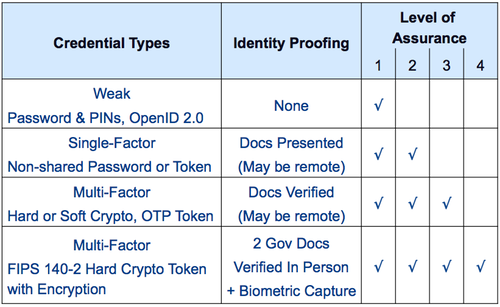 Once the minimum needed LOA has been determined, it is straight forward to map that to the type of credentials that can support the needed LOA using the “NIST Electronic Authentication Guideline (SP 800-63-1) [PDF]”. But I will emphasize a specific point that is often glossed over or de-emphasized when it comes to this mapping. The term “assurance” has a specific meaning here and is defined as