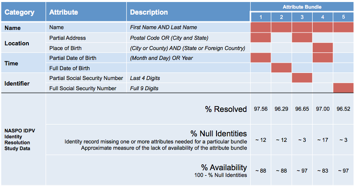 My recommendation here would be to leverage the work that has been done by the ANSI/NASPO Identity Proofing and Verification (IDPV) Standard Development Project and [utilize one of the five attribute bundles they identified; Majority of which provide greater than 95% identity resolution for the U.S. Population][3].