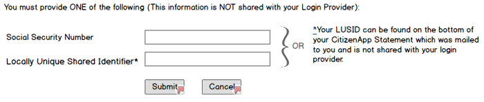 This information could be a personal access code that is printed on a paper based benefits mailer sent to the person, an existing account number, or if it already exists in the RP system, the Social Security Number. The key to note is that this information does not constitute proof of identity but simply allows the RP to use it to find a matching record in its data store i.e. It is a locally unique shared identifier (LUSID).