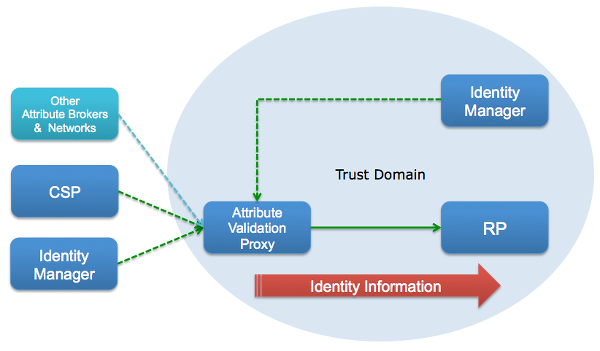 At its core, the attribute validation proxy is all about the specialized brokering of attributes from sources that are external AND internal to the RP’s trust domain. It must also be interoperable with other attribute brokers (e.g. ID DataWeb Attribute Exchange Network) that exist.