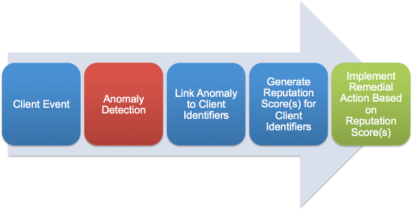 - Using the variety of information, both historical and real-time, reputation scores are generated for one or more of the client identifiers. Scores are also stored for use in future events.