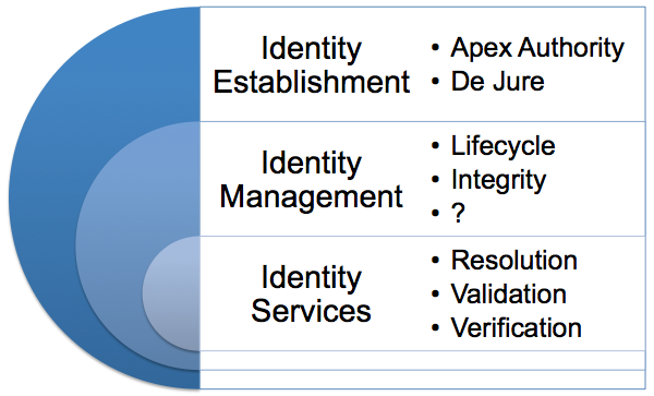 I spent a good portion of last week interacting with some smart, passionate people who are trying to move the ball forward in the identity space. That in turn triggered some thoughts on common terminology (or lack thereof), as well as around responsibility and accountability. So this is my attempt to write my way to clarity on some of those topics.